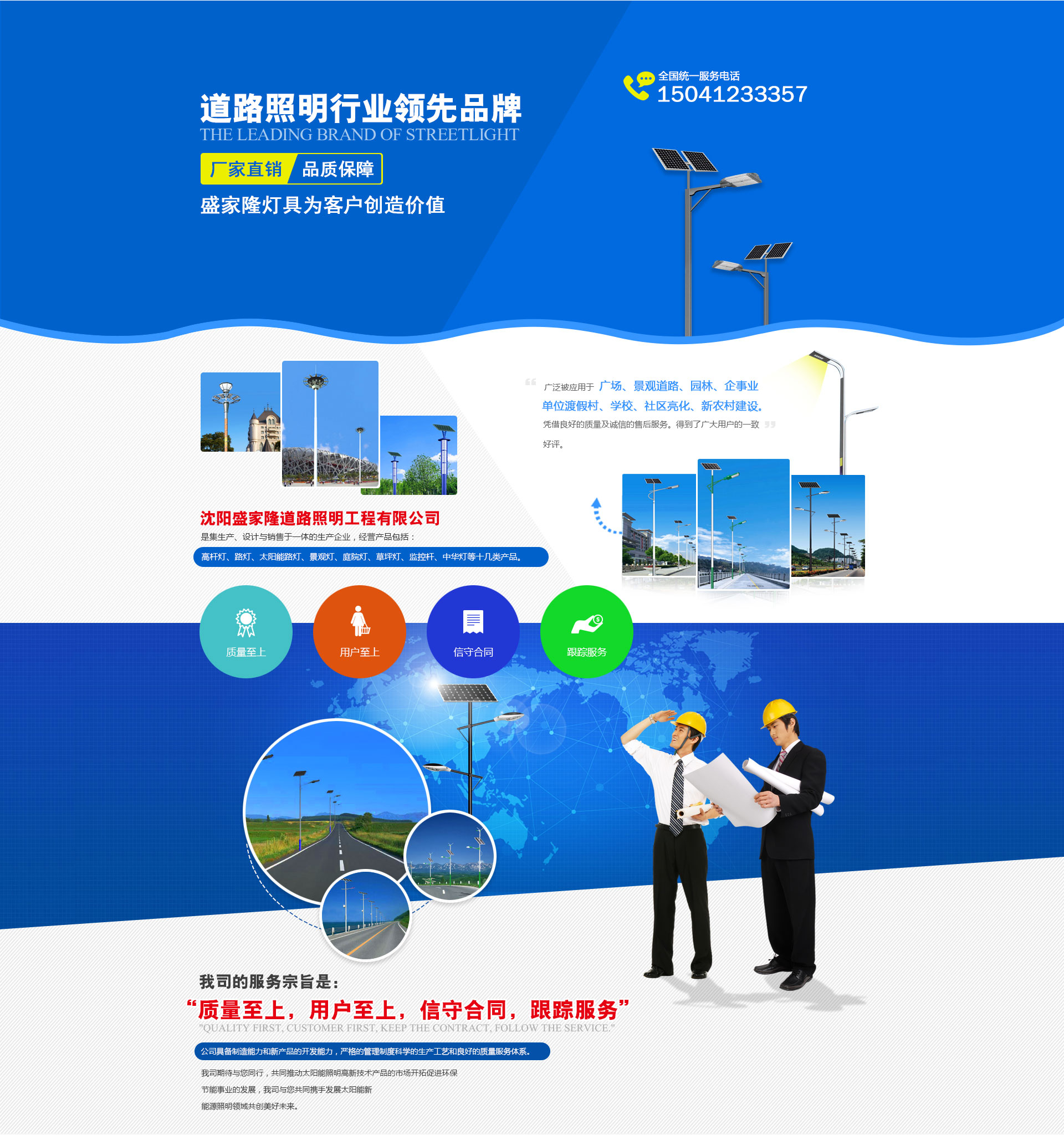 沈陽盛家隆道路照明工程有限公司坐落于沈陽市于洪區(qū)興盛村愛國(guó),生產(chǎn)各種室外,道路,廣場(chǎng),車站,碼頭,橋梁,庭院及室內(nèi)工礦照明燈具,品種有太陽能路燈,道路燈,LED路燈,組合燈,景觀燈,庭院燈,草坪燈,彩色泛光燈,中高桿燈以及配套使用的各種路燈頭,鎮(zhèn)流器,觸發(fā)器開關(guān)箱等系列產(chǎn)品。 本公司自成立以來,已初具規(guī)模,現(xiàn)有高級(jí)技術(shù)人員5人,中級(jí)技術(shù)人員28人,研究設(shè)計(jì)人員14人,車間工人百余人,并備有大型斬彎?rùn)C(jī),1600t-900t壓鑄機(jī),20t行吊,高速縱剪機(jī),埋弧自動(dòng)焊,彩色噴塑線燈先進(jìn)設(shè)備,高科技創(chuàng)造高質(zhì)量,由我公司生產(chǎn)的各種類型的照明燈具,不僅質(zhì)量可靠而且線條流暢,外形美觀,深受廣大客戶的喜愛,長(zhǎng)期以來,我公司一直注重產(chǎn)品質(zhì)量,堅(jiān)持“質(zhì)量是企業(yè)的生命”的宗旨。由于質(zhì)量可靠,價(jià)格合理,服務(wù)周到,從而贏得了廣泛的市場(chǎng)聲譽(yù)。企業(yè)先后被評(píng)為“質(zhì)量信得過企業(yè)”“重誠(chéng)信守信用企業(yè)”,“AAA級(jí)資信企業(yè)”,并通過ISO9001:2000國(guó)際質(zhì)量體系認(rèn)證,ISO14001:2004環(huán)境管理體系認(rèn)證,CCC,CQC國(guó)家強(qiáng)制性產(chǎn)品認(rèn)證和持有道路照明二級(jí)安裝,安全生產(chǎn)資質(zhì)。